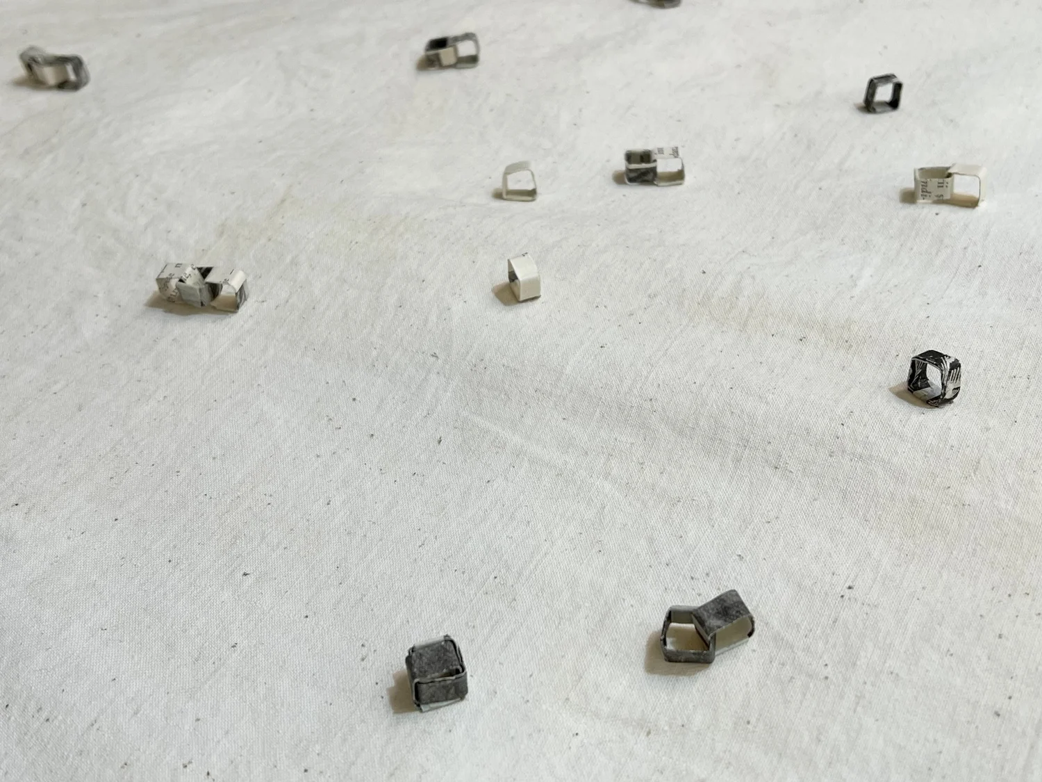 fabric, tin, wire, paper, wood, thread  54 x 36 x 3 inches  2022