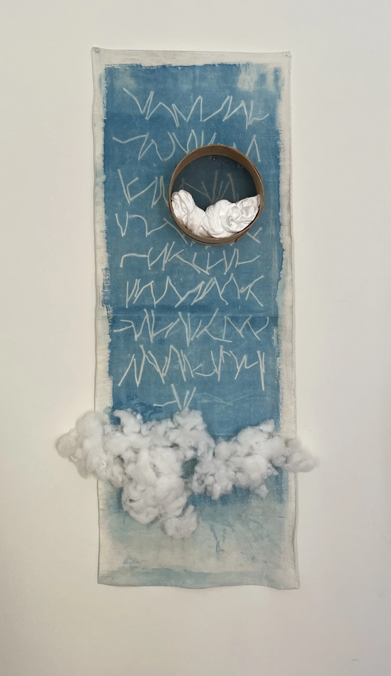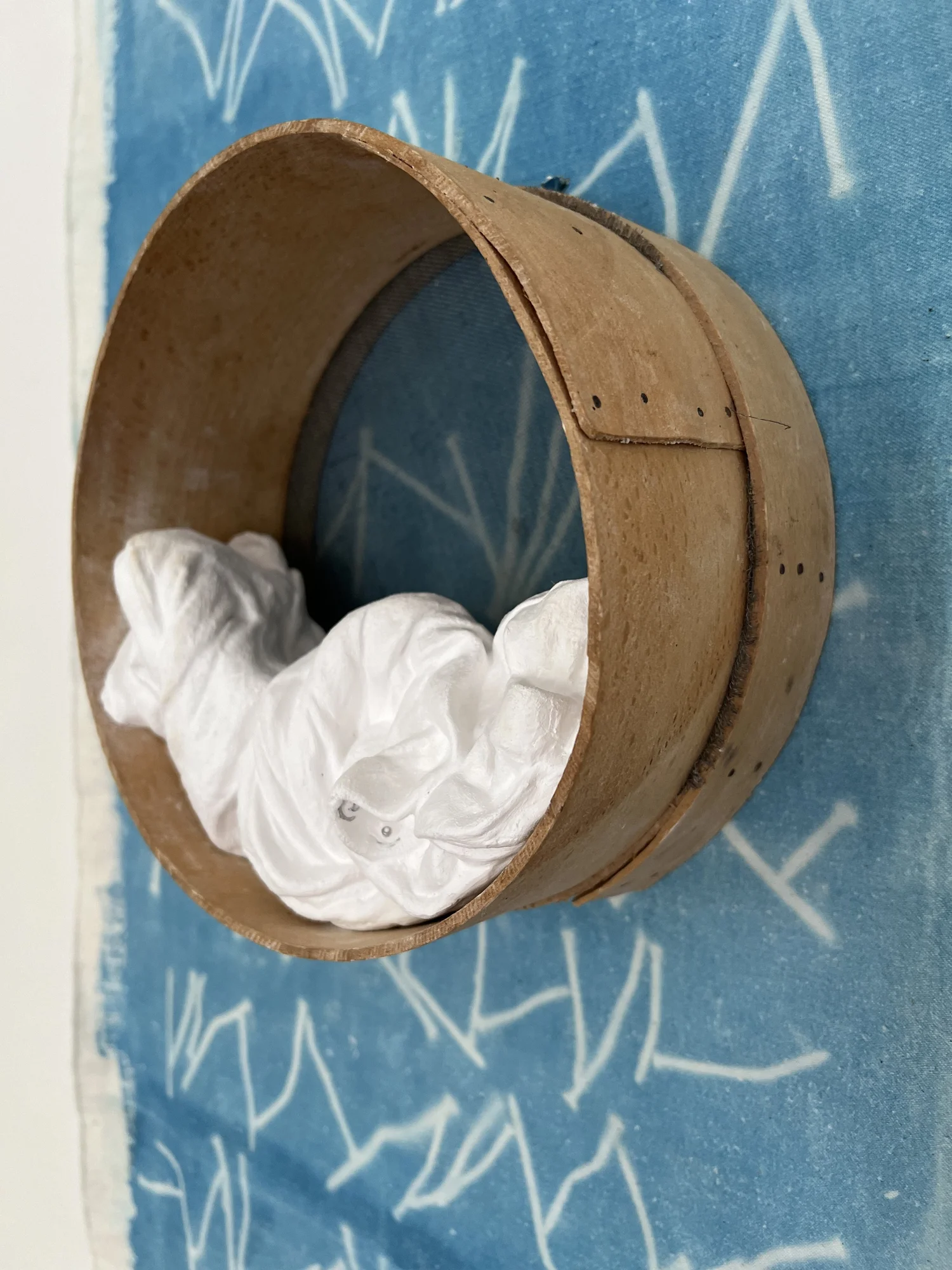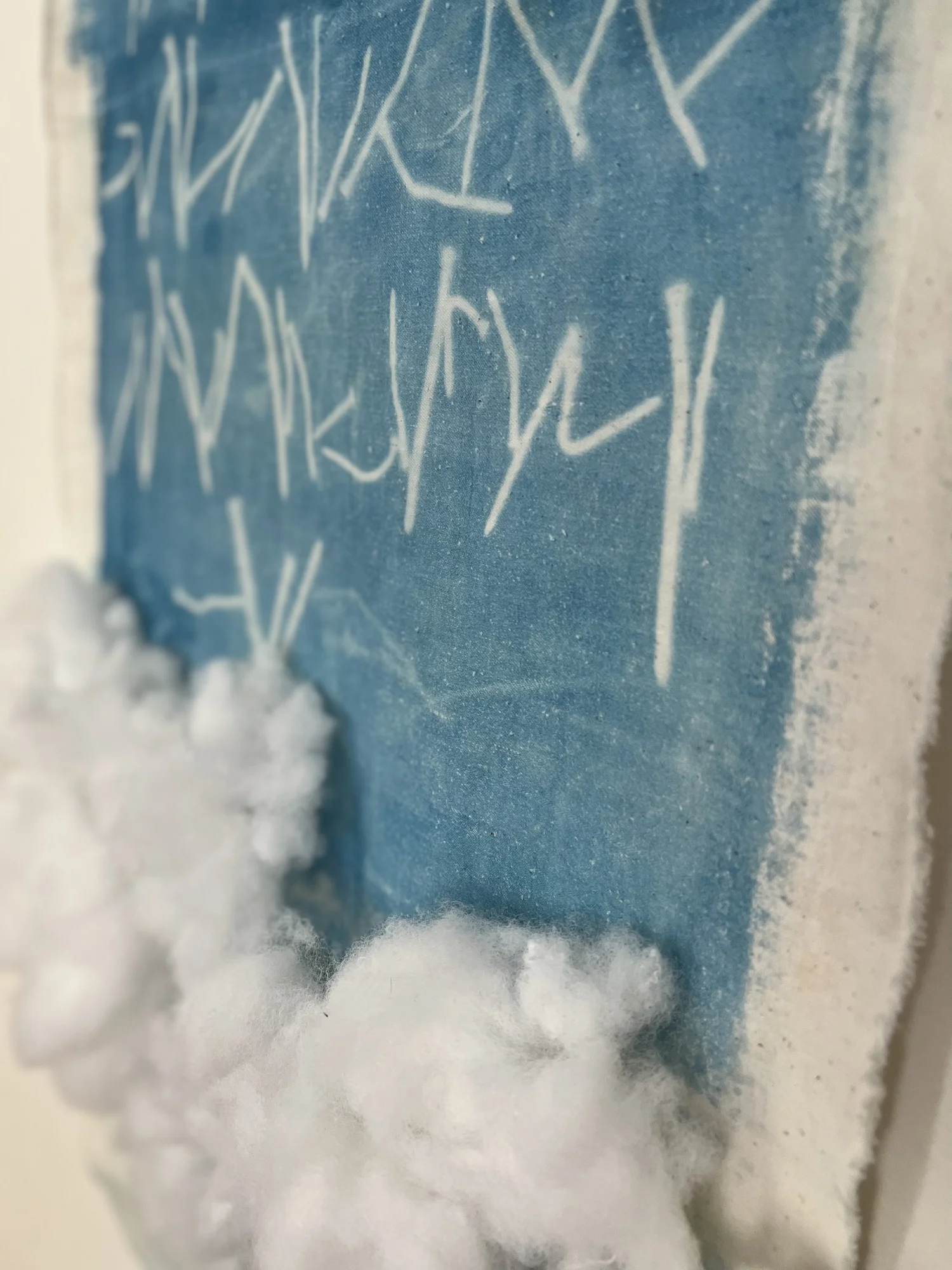 cyanotype on fabric, paper, wood, mash, wool, fabric, plaster  52 x 17 x 4 1/4 inches  2022